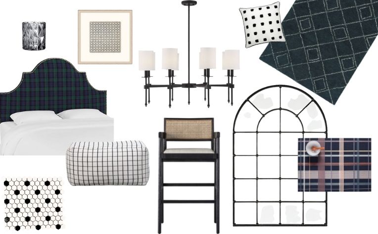 Looking for a subtle way to incorporate checks and plaids? Oftentimes these two are thought of as just a print found in textiles, however, this trend plays on the creation of shapes and lines. Play with the structure of your furnishings, such as layering in cane-backed dining chairs, plaid headboards, and palladian-style windows and mirrors. Even using structural light fixtures as points of interest works to establish a common checkered theme, like this 8-light chandelier by Savoy house.